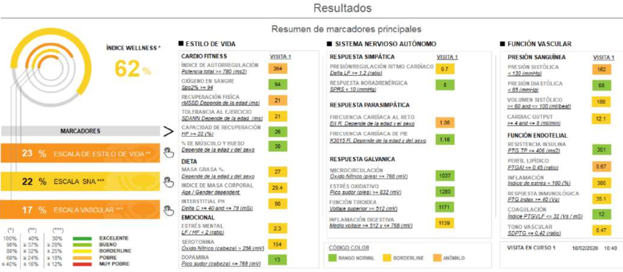 El sistema WMS genera un Índice Wellness, que resume el estado funcional del organismo integrando tres áreas principales: