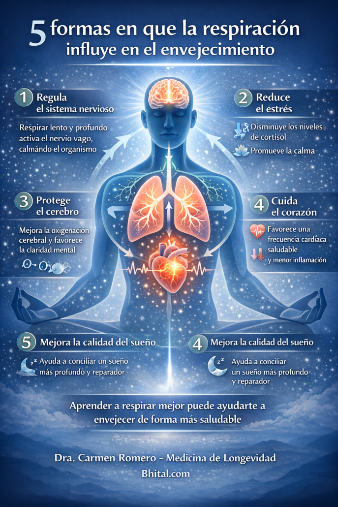 Por este motivo, muchos especialistas consideran que el entrenamiento de la respiración puede formar parte de un enfoque integral de medicina de longevidad.