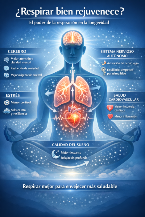 Por eso, cuando se plantea la pregunta “¿respirar bien rejuvenece?”, la respuesta más precisa sería esta: no rejuvenece literalmente, pero sí puede contribuir a crear un entorno fisiológico más favorable para envejecer mejor.